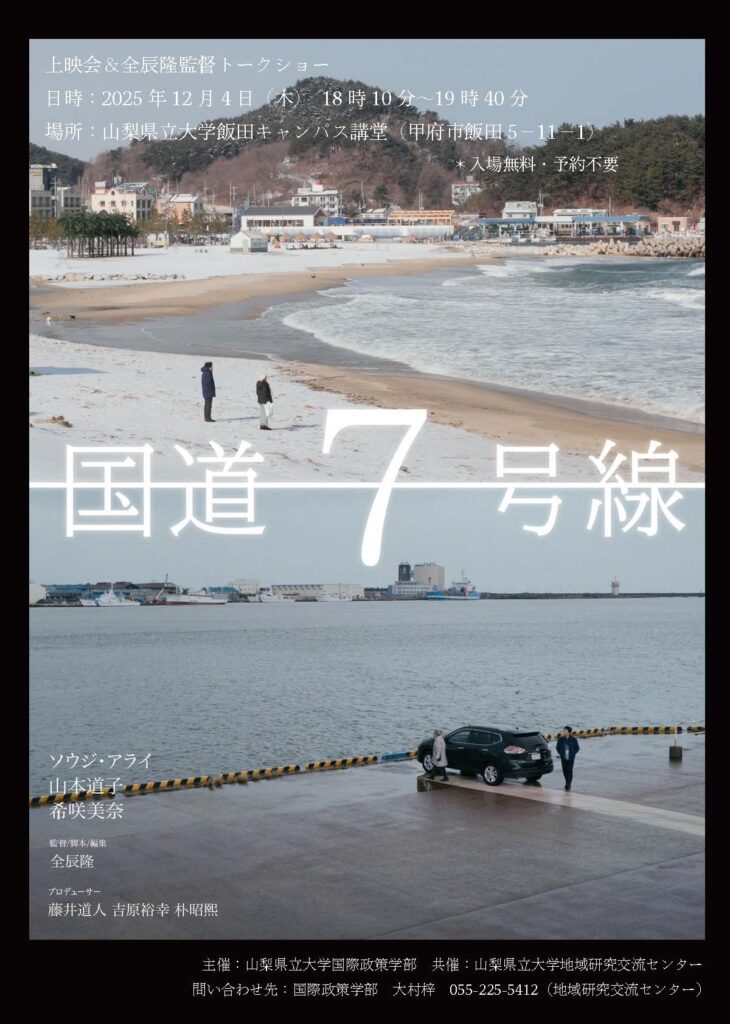 「国道7号線」上映会&全辰隆監督トークショー / イベント / By 国際政策学部 「国道7号線」上映会&全辰隆監督トークショーを開催いたします。入場無料・予約不要、直接会場にお越しください。=======================================================日時:2025年12月4日(木)18時10分〜19時40分場所:山梨県立大学飯田キャンパスB館 講堂(山梨県甲府市飯田5-11-1)=======================================================主催:山梨県立大学国際政策学部共催:山梨県立大学地域研究交流センター問い合わせ先:国際政策学部 大村梓055-225-5412(教務連携課/地域研究交流センター)